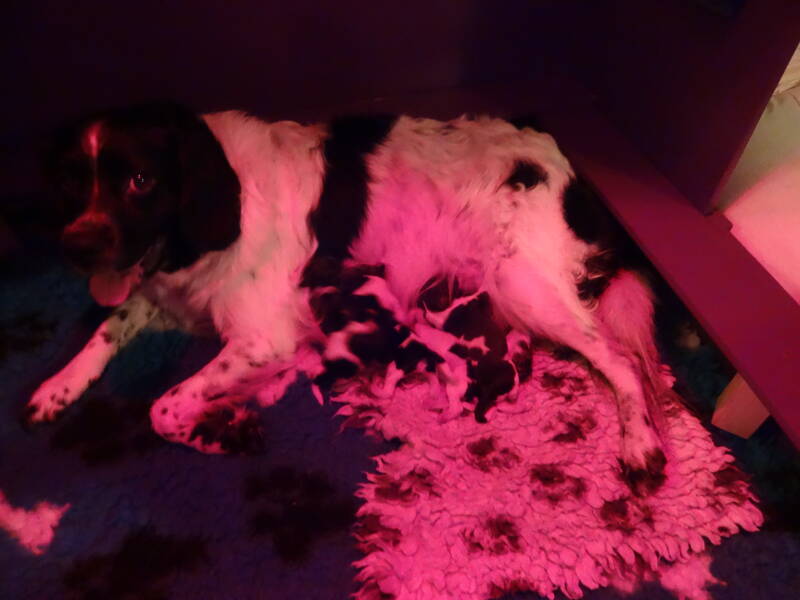 We leggen de pups even onder de lamp en maken de werpkist schoon. Dit was een hele andere ervaring dan de vorige nesten maar we zijn uiteindelijk heel blij met de 5 gezonde pups.