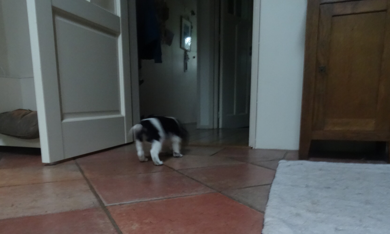 De pups gaan op ontdekkingstocht in de kamer, keuken en de hal.