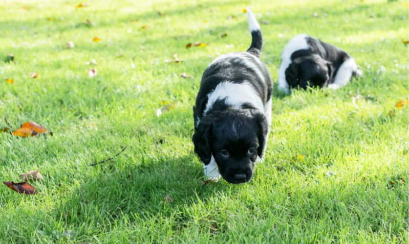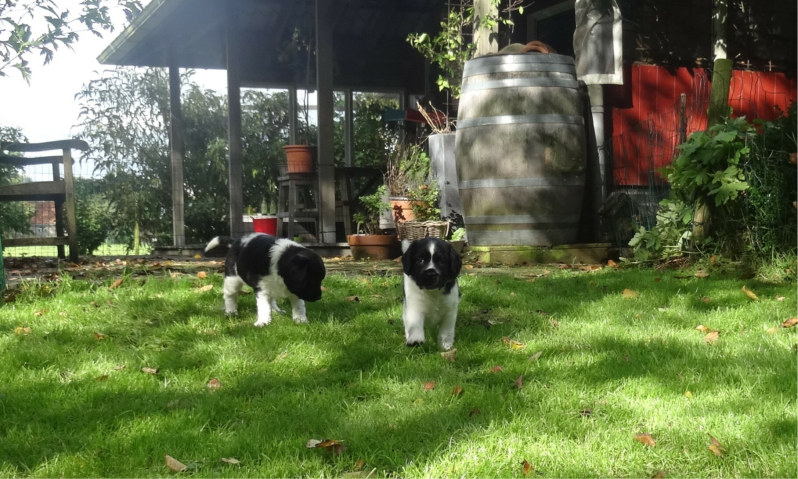 De buitenren is klaar, voorzichtig proberen de pups 1 voor 1 uit hoe ze het afstapje moeten nemen en dan: de eerste stapjes op het gras!
