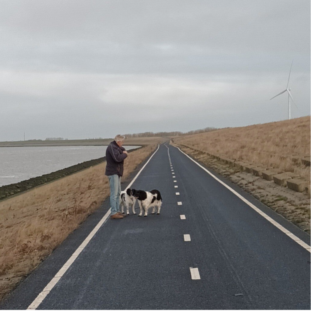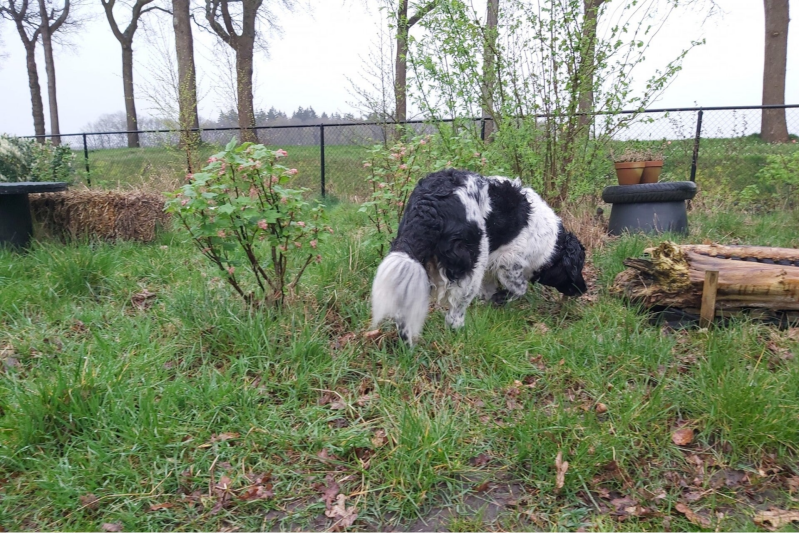 5 april 2024: Baukje mocht weer sneupen bij Willem, ze herkende de locatie en wilde direct zelfstandig op onderzoek uit, de regen gaf niks.