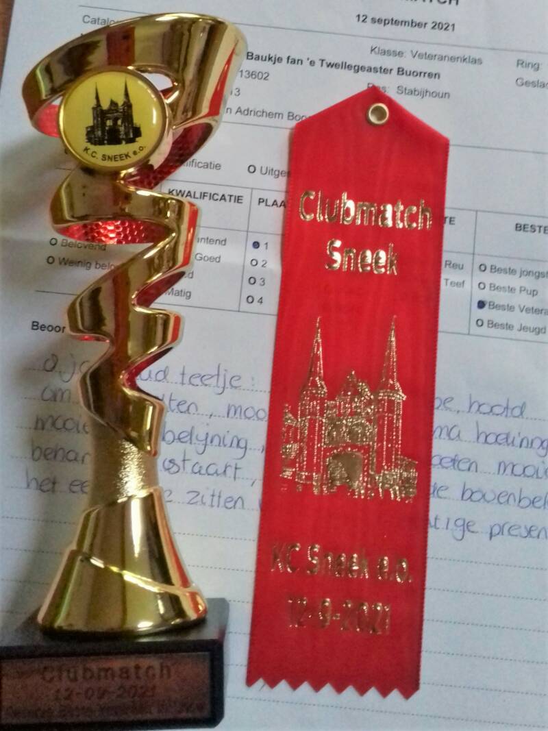 Door corona waren er in 2020/2021bijna geen shows. De Clubmatch van de KC Sneek ging beide jaren wel door, op een ruim buitenterrein. In 2021 heeft Baukje meegedaan, de keurmeester was mevrouw Van Adrichem-Boogaert Kwint. Ze was heel blij Baukje nog een keer te mogen keuren op veteranenleeftijd. Vanwege drukte met Fimke haar nestje had ik van te voren weinig geoefend , het gangwerk liet dan ook te wensen over. Maar Baukje kreeg een Uitmuntend en een prachtig keurrapport, ze werd Reserve Beste Teef en Beste Veteraan bij de Stabij's. In de erering haalde ze de 2e plaats bij de Veteranen en kreeg een mooi beker. Een mooie afsluiting van haar showcarriere?
